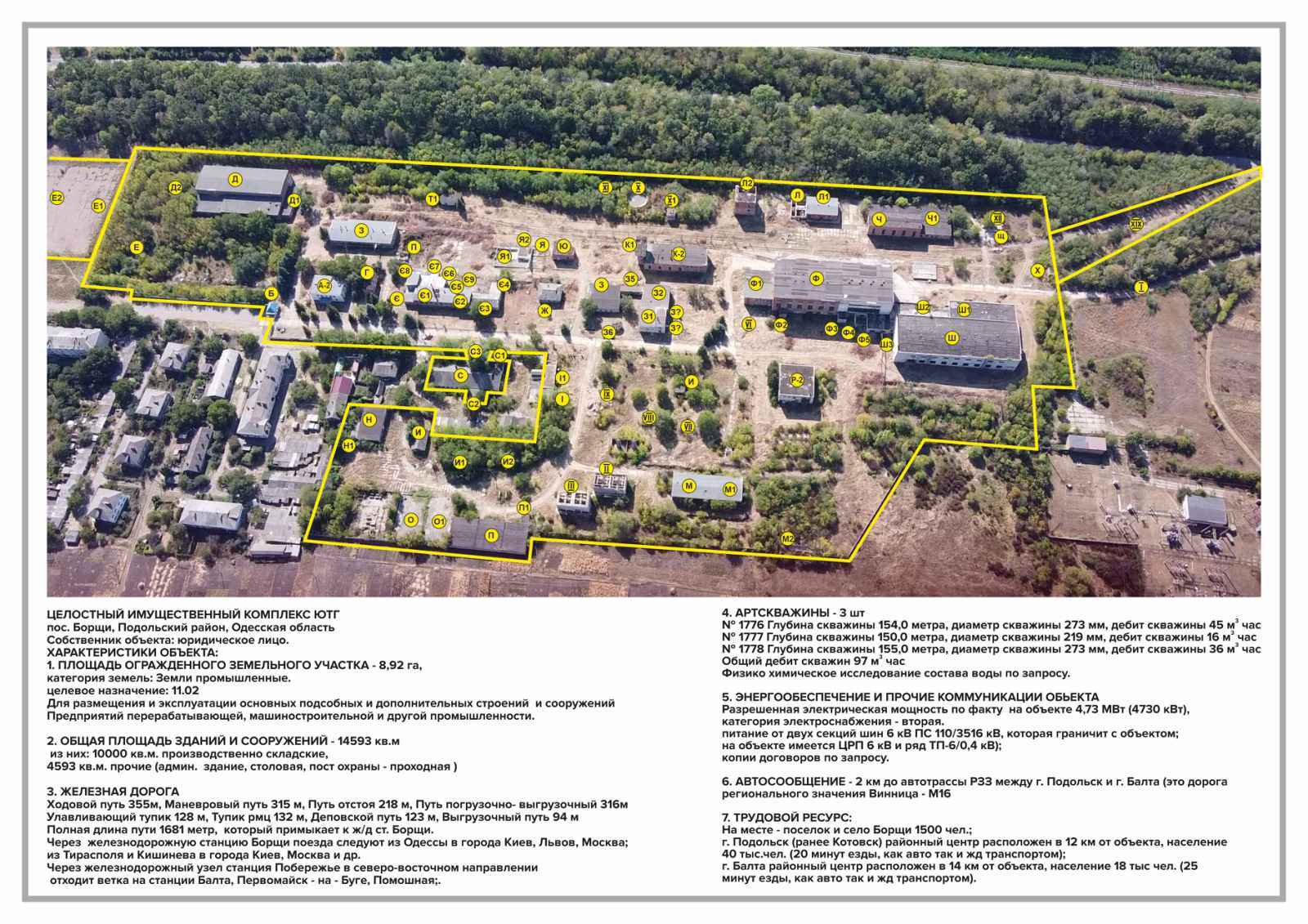 Продаж майнового комплексу під індустріальний парк (узгоджено) у місті Котовськ Одеської обл. Об'єкт розташований за два кілометри від траси регіонального значення. Площа 8,9 га. Периметр огороджений мурованим парканом. покриття території бетонні плити. Загальна площа будівель та споруд 14593 кв. м. З них 10000 кв.м – виробничо-складські приміщення, а 4593 кв.м інші (адмін .будівля, їдальня, майстерні, гараж, пост охорони, прохідна тощо). Власна залізнична гілка, з великою розв'язкою по комплексу. Також є мостові крани вантажопідйомністю 5 т і вище. Дозволена електрична потужність 4.73 МВТ (4730 кВт). Категорія електропостачання друга (живлення від двох секцій шин 6 кВт ПС 110/3516 кВ, яка межує з об'єктом. На об'єкті є ЦРП 6кВ та ряд ТП 6/0.4 кВ). Вода – є харчування від загального водопроводу селища, власні свердловини закупорені, є власна водопровідна мережа територією. 1. Залізничний зв'язок - є залізнична гілка, з великою розв'язкою на території об'єкта, довжиною 1,745 км (з них 1,445 км на території), яка примикає до залізничної ст. Борщі. 2. Автосполучення-2,0 км до автотраси РЗЗ між м. Подільськ та м. Балта (це дорога регінального значення Вінниця-М16, ділянка Подільськ-Балта повністю реконструйована). 3. Трудовий ресурс: На місці – селище та село Борщі 1500 чол.; м. Подільськ (раніше Котовськ) районний центр розташований за 12 км від об'єкту, населення 40 тис.чол. (20 хвилин їзди, як авто так і залізничним транспортом); м. Балта районний центр розташований за 14 км від об'єкта, населення 18 тис чол. (25 хвилин їзди, як авто так і залізничним транспортом). Sale of a property complex for an industrial park (agreed) in the city of Kotovsk, Odesa region. The facility is located two kilometers from the highway of regional importance. The area is 8.9 hectares. The perimeter is surrounded by a brick fence. covering the area with concrete slabs. The total area of buildings and structures is 14,593 square meters. Of them, 10,000 square meters are production and warehouse premises, and 4,593 square meters are other (admin building, dining room, workshops, garage, security post, passageway, etc.). Own railway branch, with a large junction in the complex. There are also bridge cranes with a load capacity of 5 tons and above. Permitted electrical capacity is 4.73 MW (4730 kW). The power supply category is the second (power supply from two bus sections of 6 kW PS 110/3516 kV, which borders the object. The object has a 6 kV substation and a series of TP 6/0.4 kV). Water - there is food from the village's general water supply, own wells are blocked, there is an own water supply network in the territory. 1. Railway connection - there is a railway branch, with a large interchange on the territory of the object, 1,745 km long (of which 1,445 km is on the territory), which is adjacent to the railway station. Borscht 2. Road connection - 2.0 km to the RZZ highway between the cities of Podilsk and Balta (this is the Vinnytsia-M16 regional road, the Podilsk-Balta section has been completely reconstructed). 3. Labor resource: There are 1,500 people in the village and village of Borshchi; the city of Podilsk (formerly Kotovsk), the district center is located 12 km from the object, population 40 thousand people (20 minutes drive, both by car and by rail); The district center of Balta is located 14 km from the facility, the population is 18,000. (25 minutes drive, both by car and by train). ID: 726