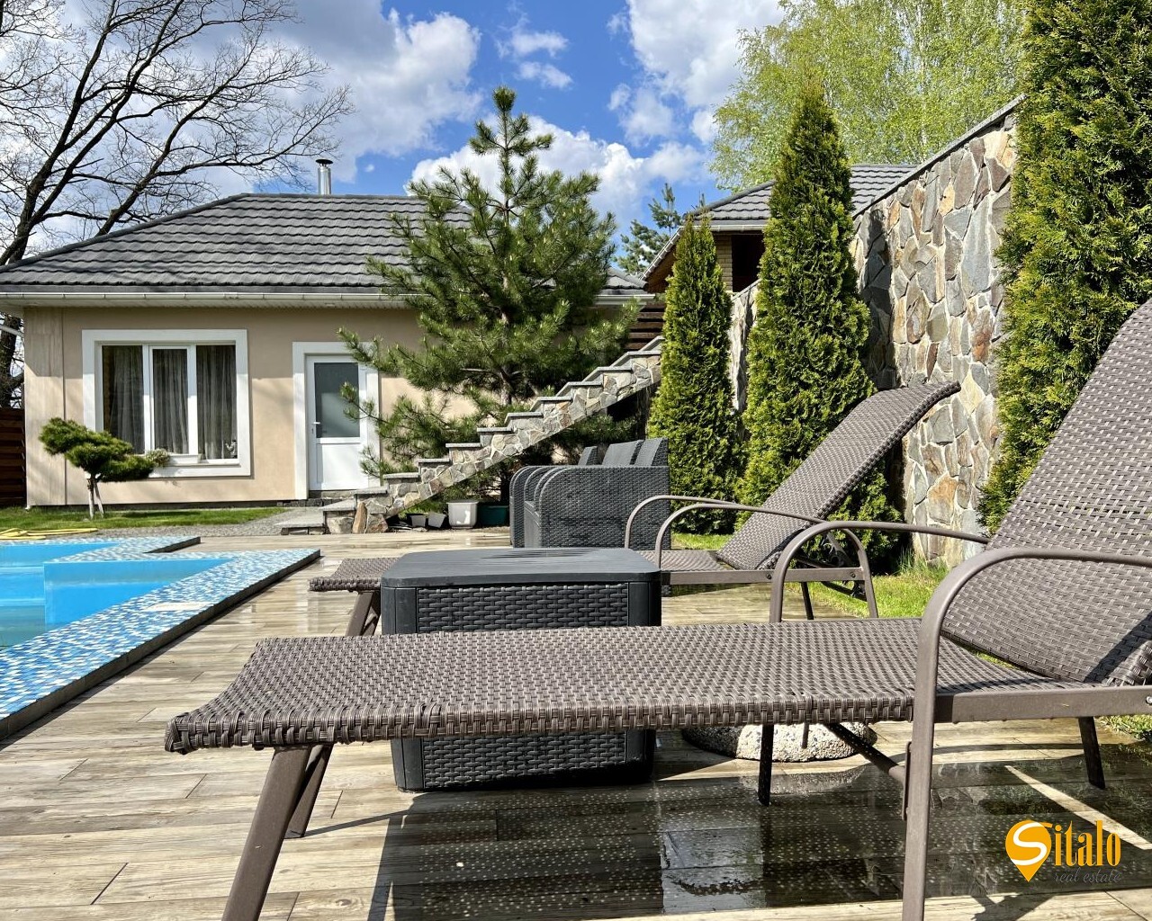 Представляем Вашему вниманию роскошный трехэтажный дом с бассейном и панорамным видом, расположенный в живописном селе Лесники. Дом находится в непосредственной близости от знаменитого загородного конного клуба Equides Club, который включает в себя спа-центр Wellness Centre, спортивно-стрелковый клуб Steel Argument, гольф-клуб и ресторан Chalet Equides. Дом с общей площадью 630 квадратных метров расположен на участке площадью 18 соток и состоит из семи просторных комнат. Первый этаж включает в себя просторный холл, гостиную с мраморным камином, большой кабинет, а также кухню, которая переходит в зимний сад с потрясающим панорамным видом. Оттуда можно выйти в открытый бассейн и наслаждаться прекрасной погодой. Второй этаж располагает холлом и тремя роскошными спальнями со своими санузлами. На третьем этаже расположены еще три спальни и дополнительный санузел. Подвал же служит бомбоубежищем, а также включает в себя бильярдную, винный погреб и гараж на три автомобиля. На участке, помимо дома, также находится сауна с комнатой отдыха, открытый бассейн размером 10,5 на 4 метра с красивой подсветкой, беседка с мангалом, а также домик для генератора. Также есть парковка под шесть автомобилей. Дом построен из кирпича марки 150 и облицован иранским травертином и гранитом. Внутренняя отделка дома выполнена из мрамора для пола и лестницы, массива красного дерева для пола в спальнях, а также итальянских натуральных известковых материалов для стен и венецианской штукатурки для потолков. Плитка и сантехника также производства Италии и Испании. В здании установлены газовый и электрический котл