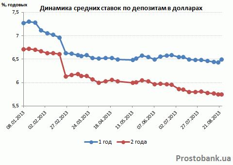 По исследованию компании «Простобанк Консалтинг», максимальные ставки по долларовым депозитам сроком на год с января по август-2013 уменьшились на 0,5 процентного пункта – до 11% годовых. А по депозитным программам на два года – на целых 1,25 процентного пункта, до 10% годовых.