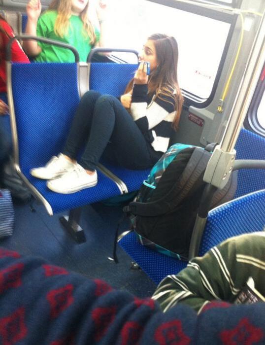 Только настоящие хулиганы могут позволить себе так ездить в общественном транспорте.