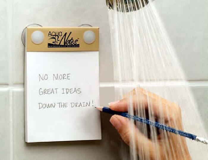 Водонепроницаемый блокнот. Как много прекрасных и гениальных идей не получили воплощения, потому что пришли нам в голову в душе и были благополучно забыты? Дизайнеры, как люди творческие, серьезно подошли к решению этой проблемы и выпустили водонепроницаемый блокнот, который можно прикрепить прямо на кафельную стену. Он оснащен присосками, специальным карандашом и имеет 40 перфорированных листов.