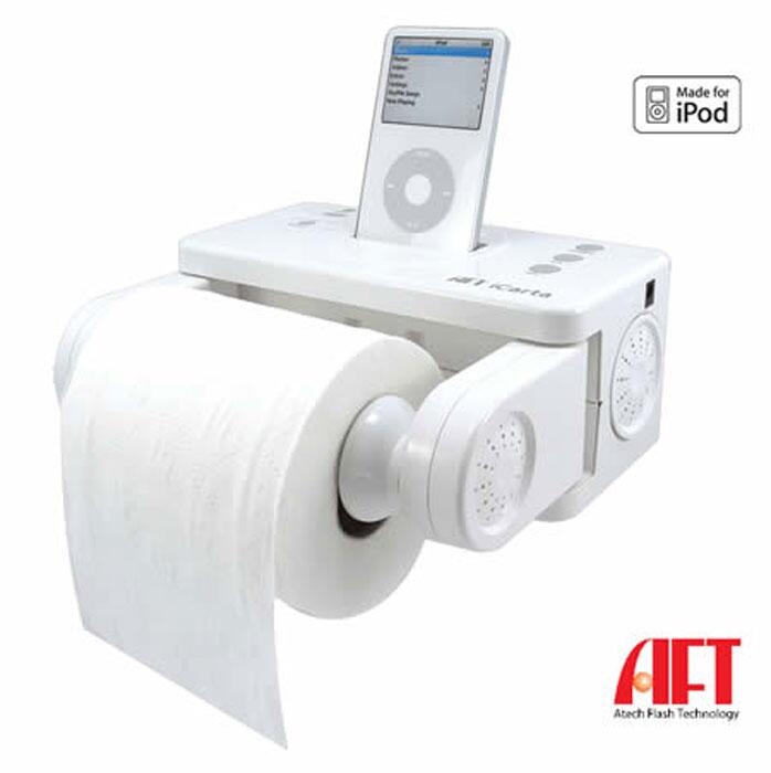 Держатель для туалетной бумаги. Раньше держатели для туалетной бумаги оснащали подставками для газет – но сейчас привычки людей изменились. Теперь в держатели встраивают стойки для iPod и зарядные устройства – это обойдется дешевле, чем радио для душа.
