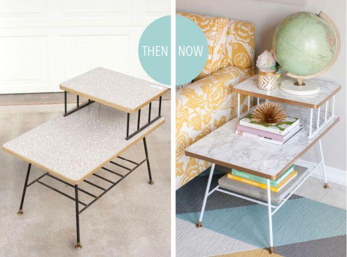 Журнальный столик, покрытый мраморной пленкой, способен изменить внешний вид всей комнаты.