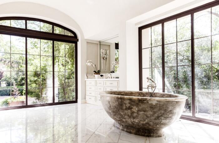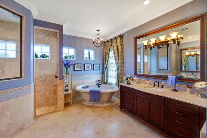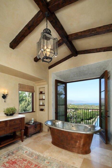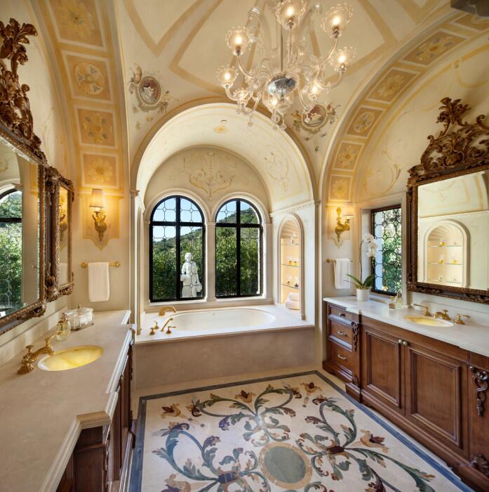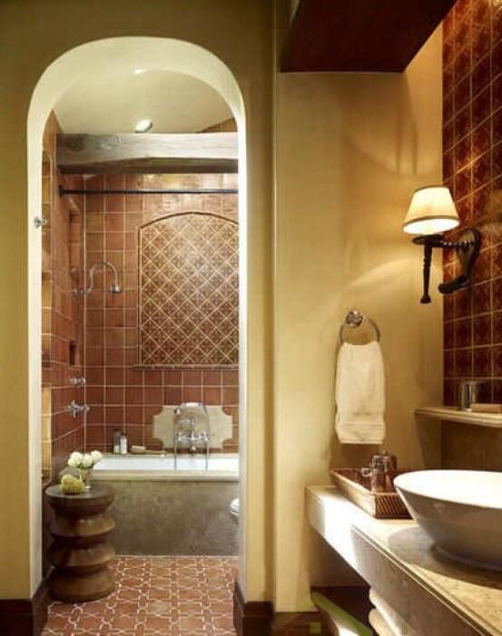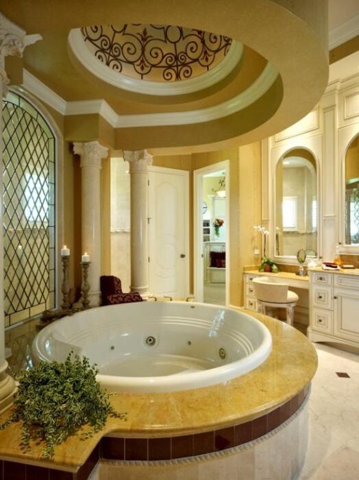 Роскошная круглая ванна. Поклонникам испанских, итальянских, греческих, французских и североафриканских мотивов в интерьере так же, наверняка, понравятся 10 золотых правил оформления современной спальни в средиземноморском стиле .
