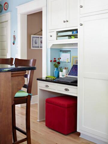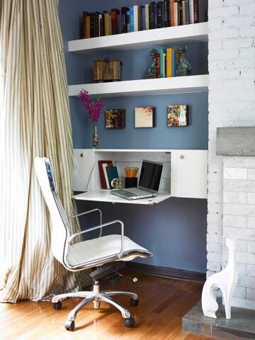 Скрытый офис — идеальное решение для тех, кто проводит в нем лишь небольшую часть времени. Для того, чтобы не загромождать пространство столами и шкафами, спроектируйте подвесной шкафчик таким образом (или купите уже готовый), чтобы дверка одной из секций шкафа открывалась горизонтально и фиксировалась параллельно полу. Следите за тем, чтобы крепежи были достаточно прочными, чтобы выдержать ноутбук и другие принадлежности.