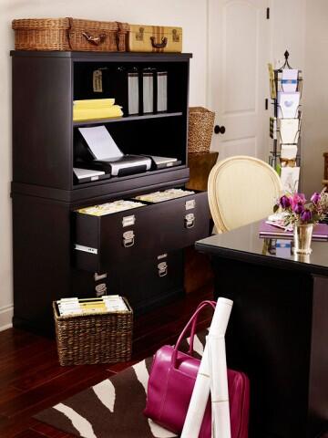 Создайте угловое рабочее место в гостиной. Для этого достаточно поместить рабочий стол, небольшой шкаф для хранения бумаг и канцелярии, а также несколько полок вдоль одной из стен. Всегда удобнее хранить небольшие вещи в небольших емкостях или ящиках. Используйте для этой цели универсальные в своей практичности плетенные корзины. Корзины с крышками заменят коробки, а корзины с открытым верхом, расположенные на полке, заменят выдвижные ящики. Меньше пыли, меньше уборки, больше места для хранения!
