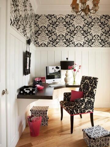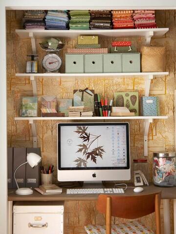 Рабочую зону можно обустроить где-угодно, как один из вариантов — в лоджии, если она предусмотренная планировкой. Украсьте глухую стену необычным рисунком (но не слишком ярким, чтобы он вас не отвлекал от важных дел), декорируйте каждую коробочку и емкость бумагой для скрапбукинга или тканью в тон. Можно придерживаться одной тематики (как в нашем случае — природа) или одного стиля, чтобы совместить все элементы воедино. Интересная деталь — прозрачная емкость для хранения всевозможных бумажек и записок. Такое себе декоративное ведерко.