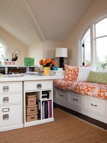 Разместив рабочее место возле окна, вы вдвойне экономите. Во-первых окно — источник естественного освещения большую часть суток. Во-вторых, оконный подоконник можно использовать как полку, складируя на нем необходимые вещи в коробках или корзинах.