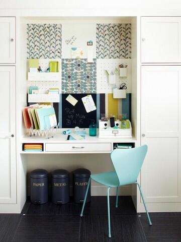 Как сделать так, чтобы порядок как можно дольше сохранялся на рабочем месте? Следуйте одному простому правилу: все часто используемые вещи должны быть легко доступны в любой момент времени, все редко используемые — прятаться в шкафах, на дальних полках и в ящиках. Если у вас всегда нагромождается множество мелких вещиц, как-то записок и канцелярских принадлежностей — смастерите доску за столом, на которую можно легко добавлять новые записки (с помощью булавок или магнитов) и ячейки для хранения канцелярии. Также можно добавить мини-классную доску с мелками.
