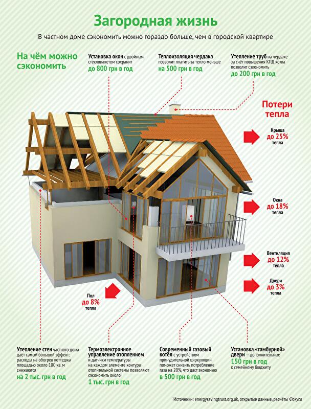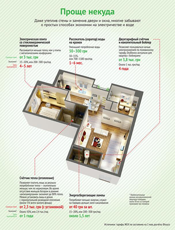 После повышения тарифов львиная доля коммунальных платежей приходится на отопление. Семья из трёх человек, проживающая в квартире площадью около 50 квадратов, будет тратить на него в отопительный сезон по 800 грн в месяц или 4,8 тыс. грн в год. При этом потери тепла в многоквартирном доме из-за неутеплённых стен, подвала и чердака, старых окон и дверей на лестничных клетках и слишком высокой температуры осенью и весной могут достигать 70%. Кроме того, если нет счётчика тепла, платить нужно по тарифам "за метраж отапливаемой площади", а они изрядно "раздуты". "Только установка счётчиков и системы погодного регулирования позволяет сократить потребление тепла на 20–25%", — поясняет Черкашин.