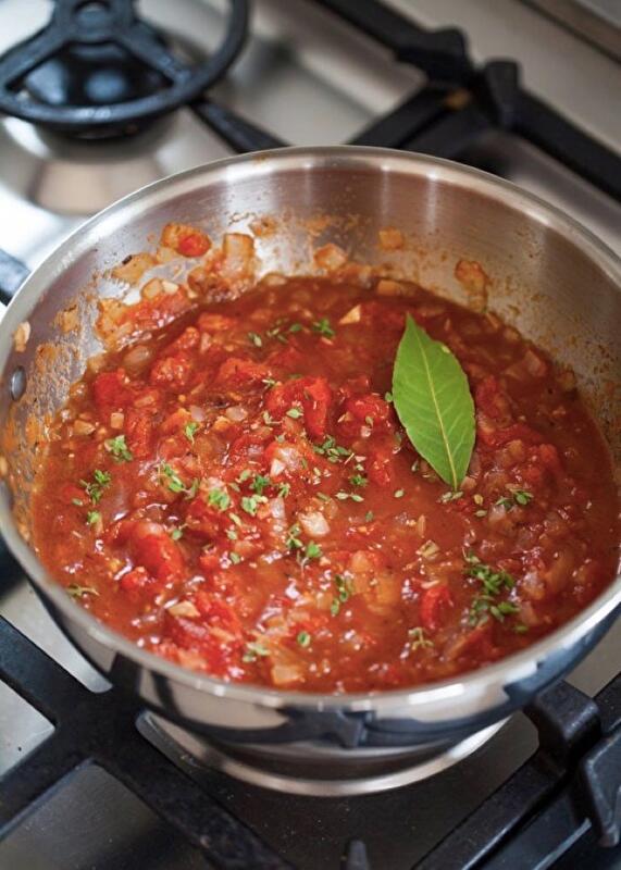 Добавляете к луку и чесноку томаты вместе с соком, хорошо всё перемешиваете и раздавливаете ложкой. Затем добавляете в соус лавровый лист и свежий тимьян или орегано. Если вы решили использовать базилик, его нужно добавлять в самом конце.