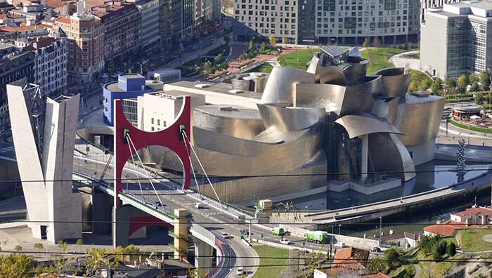 Шедевр Фрэнка Гери на закате Автором великолепного и запоминающегося с первого взгляда испанского филиала музея современного искусства Соломона Гуггенхаймама является канадский архитектор Фрэнк Гери. Здание музея, построенное из стекла, титана и песчаника, признано одним из самых зрелищных в мире строений в стиле деконструктивизма. Главной целью Гери было придание музею, расположенному на набережной, облика футуристического корабля.