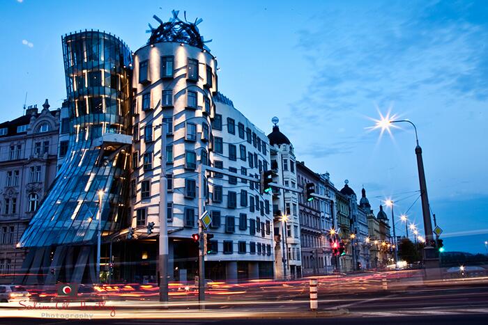 Эффектная подсветка на фасаде здания Дом в Праге, напоминающий танцующую пару, является офисным. Выполненный в стиле деконструктивизма комплекс состоит из двух цилиндрических башен: нормальной и деформированной. Танцующий дом - это архитектурная метафора пары, сошедшейся в красивом танце. Практически сразу после строительства дом приобрел шутливое прозвище «Джинджер и Фред» в честь известной американской пары киноактеров Джинджер Роджерс и Фред Астер.