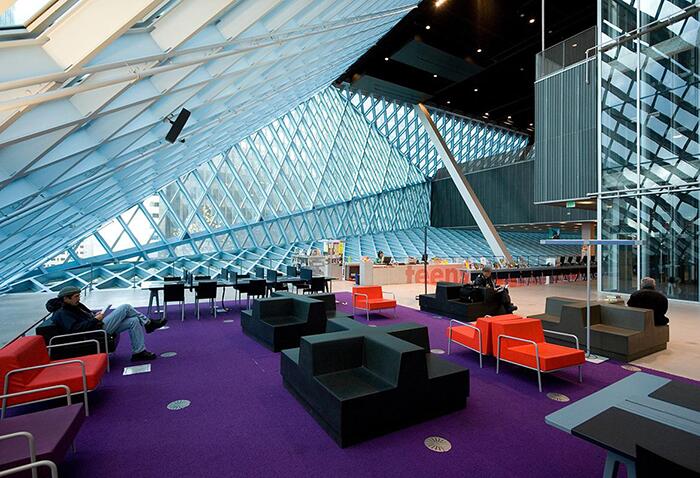 Интерьер библиотеки Футуристичное здание центральной библиотеки Сиэтла было спроектировано голландским архитектором Ремом Коолхасоми и построено в 2004 году. Главной целью возведения этого футуристичного комплекса служит привлечение настоящих ценителей книг. Здание состоит из четырех фасадов, оформленных металлической сеткой и стеклом. Интересно, что в нем отсутствуют прямые углы и параллельные линии.