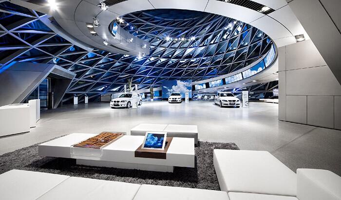 Интерьер комплекса Победителем конкурса на строительство выставочного центра авто-гиганта BMW, проведенного в начале 2000-х, стало бюро Himmelb(l)au. В своем проекте архитекторы предложили концепцию пространства, которое станет одновременно и «шоу-румом», и местом для переговоров между представителями концерна и его клиентами. Главной архитектурной фишкой проекта стала огромная воронка, состоящая из стеклянных блоков. У посетителей создается ощущение, что парящую в небе крышу будто засасывает в эту воронку.
