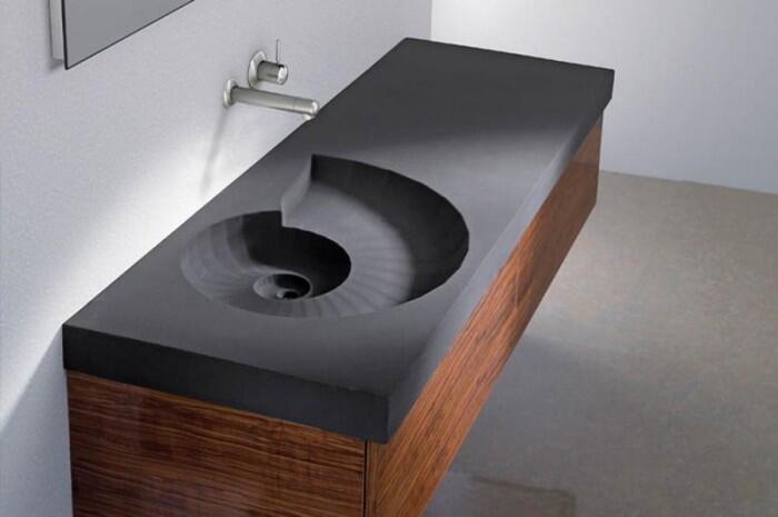 Умывальник в темном цвете, напоминающий раковину улитки.