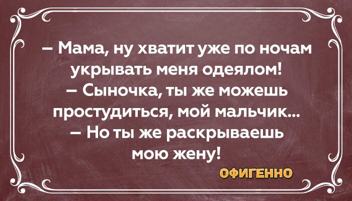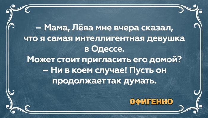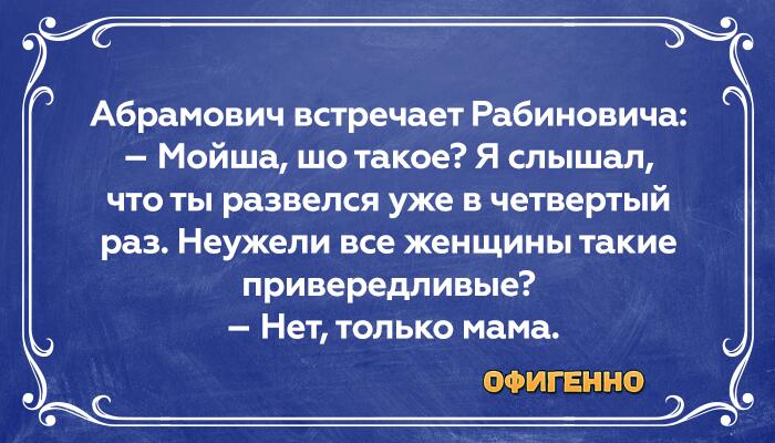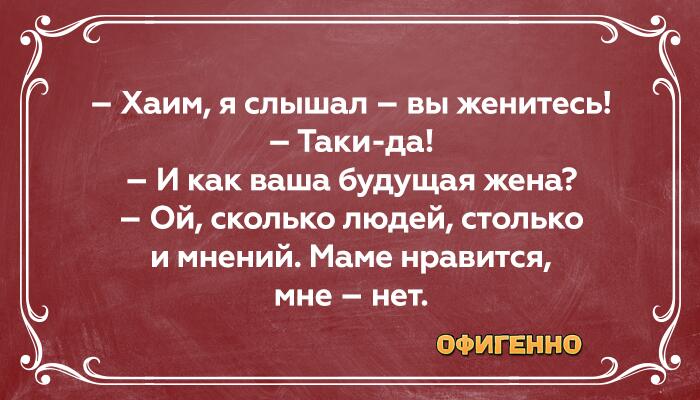 В который раз убеждаюсь, что еврейский народ обладает неповторимым чувством юмора. Так тонко могут сказать и подметить только они. А мама у евреев - это вообще святая святых, поэтому ее слово - закон. Не забудь поделиться этими замечательными открытками со всеми друзьями - им придется по душе доза хорошего юмора.