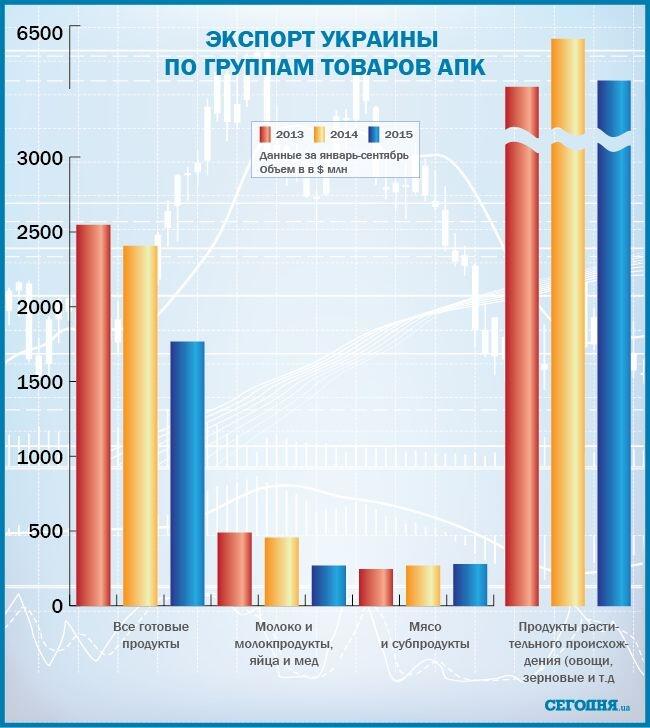 В 2014-м году, из-за санкций России, на первом месте по объему экспорта в Россию оказались производители готовой продукции из зерна – они экспортировали товаров на 133 млн долларов. Несмотря на "торговую войну", в 2015-м году нарастили свой экспорт в РФ производители мяса и съедобных субпродуктов. Всего за 9 месяцев они реализовали свою продукцию на 90 млн долларов, в то время как за весь 2014-й год – всего на 71 млн долларов.