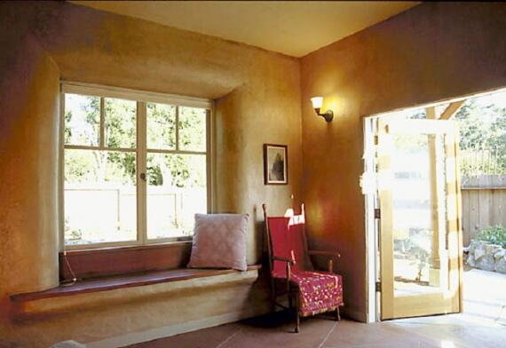 А мы перейдем к следующему интерьеру в доме из глины, построенном на Майянских островах, Канада. Капитальное строительство этого дома было завершено летом 1999 года Пэтом Hennebery к началу 3-недельного семинара во главе с известным глиняным строителем Янто Эвансом и Эльке Коулом. Этот дом был первым домом из глины полностью разрешеным в Канаде. Это полноценный двухэтажный дом на 182 кв.м. подключен к канализации и электричеству. Приблизительные расходы на строительство составили 56000$