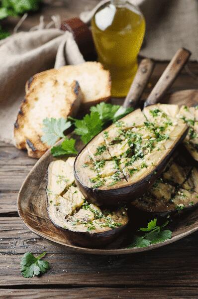 - Баклажаны с овощами достать из холодильника, украсить зеленью. Можно подавать на стол.