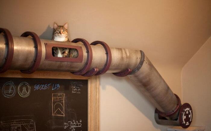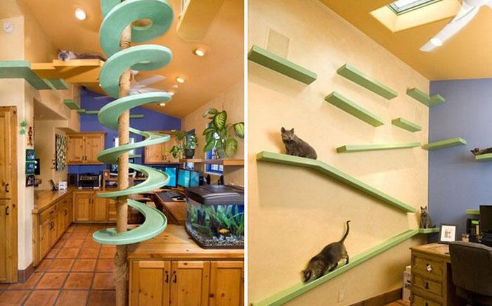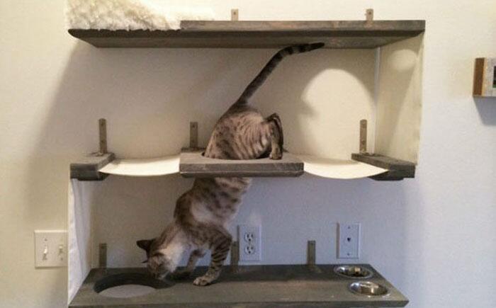 Кошачьи тропы, не ограничивающие пространство хозяина Зачем ходить по полу, если есть целая система ходов наверху. Дело в том, что в природе коты предпочитают перемещаться по верху – деревья, крыши, заборы. Создавая такие кошачьи тропы, формируются естественные условия для питомца и экономится пространство для хозяина.