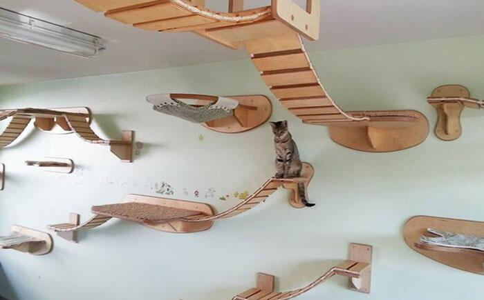 Подвесные дорожки для кота в стиле Индианы Джонс Эти подвесные кошачьи дорожки мог создать человек, который не только любит своего питомца, но и хорошо знает его инстинкты. Коты предпочитают не только перемещаться по верху, оттуда еще и легко контролировать все, что происходит. Кроме этого, такие дополнения украсят и само помещение.
