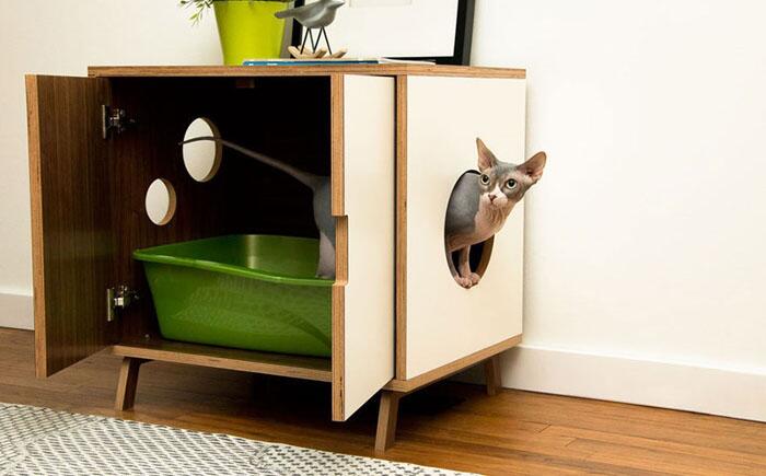 Кабинет-туалет для кота Если кто-то устал прятать кошачий туалет от гостей, может соорудить подобный кабинет-туалет. По бокам отверстия существуют для того, чтобы животное могло само проникать в этот кабинет и исчезать из него, а дверцы помогут легко доставать лоток для мытья.