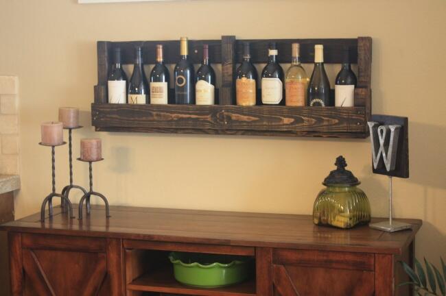 Из старых паллет можно сделать любую мебель. Например, винтажную полку для вина.