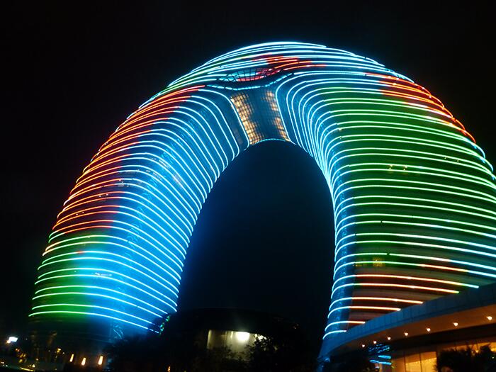 27-этажное подковообразное здание всемирного известной сети отелей Sheraton в Хучжоу было завершено в 2013 году. Благодаря своей форме здание получило прозвище "подкова". Особенно завораживающим оно выглядит по ночам, отражаясь в озере Таху и образуя со своим отражением силуэт цифры "8". Стоит отметить, что этот красивейший современный отель входит в десятку самых дорогих в мире.