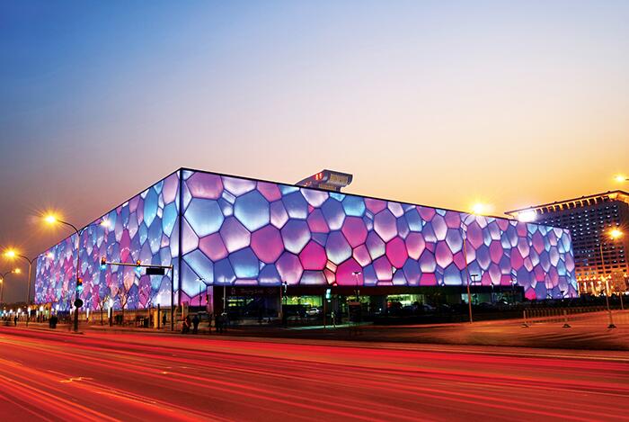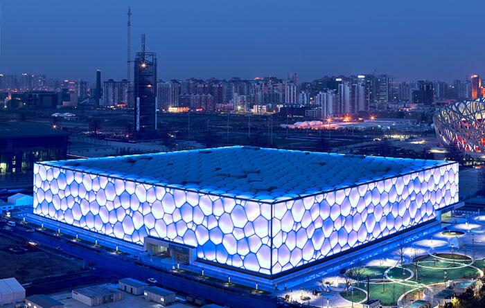 Здание национального центра водных видов спорта, также известное как "Водяной куб", стало частью большой олимпийской стройки и было официально открыто в 2008 году. Конечно, в первую очередь стоит отметить необычный фасад, напоминающий кристаллическую решетку из водных пузырей. Этот спортивный комплекс являет собой пример высокой энергоэффективности - поверхность здания способна принимать солнечную энергию и использовать ее для подогрева воды и помещений.