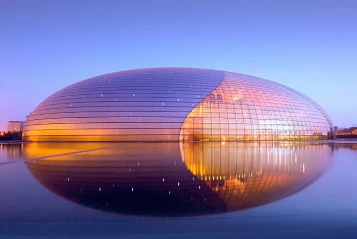 После многочисленных отказов и замораживания строительства еще на стадии проектирования главный театр Китая все-таки был построен в начале 2000-ых. Напоминающее то ли огромную каплю воды, то ли летающую тарелку, приземлившуюся в китайской столице, это невероятное сооружение сразу же полюбилось большинству местных жителей и гостей Поднебесной. Театр представляет собой куполообразную структуру длиной 212 метров и высотой около 47 метров, полностью сделанную из металла и стекла. Здание находится на поверхности искусственного озера, а входом в него служат подводные тоннели с прозрачным потолком.