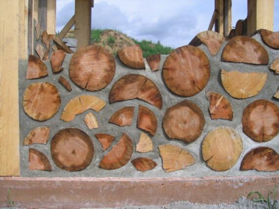 Обязательно нужно все спланировать и рассчитать. Дрова должны обязательно хорошо высохнуть перед кладкой, чтобы предотвратить их расширение и сокращение, и растрескивание внутри стены. Дрова должны сохнуть 1-2 года и для того чтобы они сохли быстрее их лучше расколоть. Перед распилом все колоды над обкорить. Дерево перед кладкой надо обработать, чтобы не гнили. Дрова должны быть длиной около 40 см. Иногда для лучшей теплоизоляции дрова выкладывают в 2 рядка. С одной стороны это двойная работа, а с другой в таком доме будет всегда тепло.