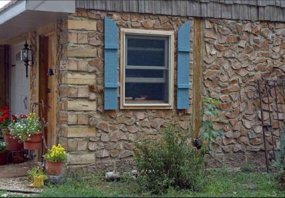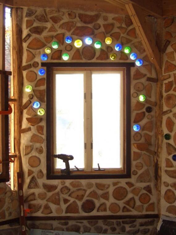 Вставки из бутылок над окном в дровяной стене.