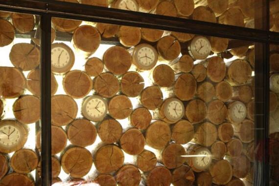 Дрова и часы зажаты между стеклом.