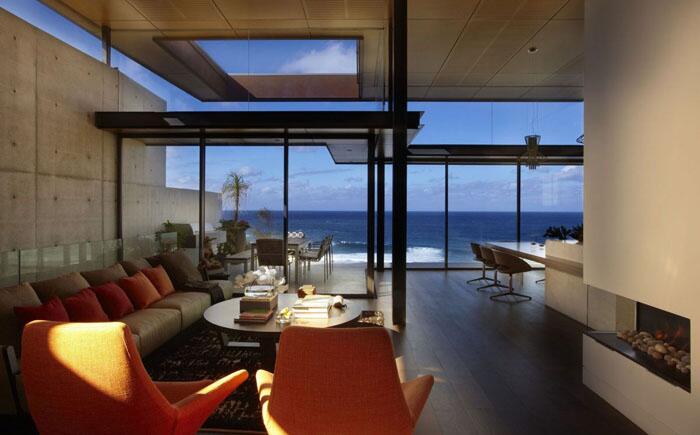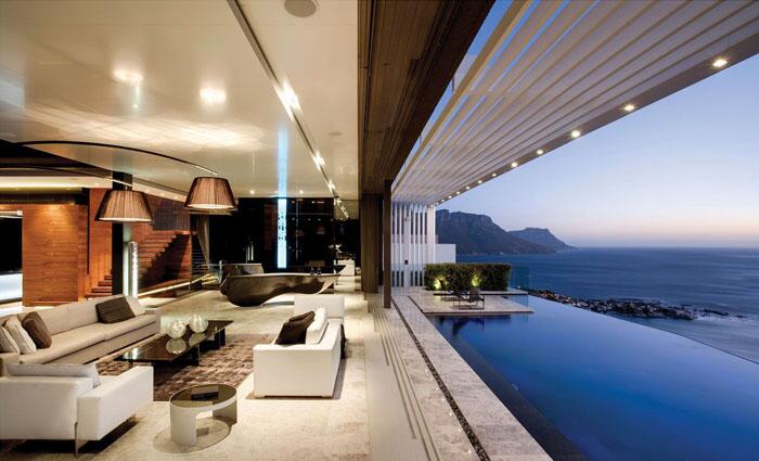 Над оформлением интерьера дома в Кейптауне работали две компании SAOTA architects и OKHA Interiors. Их дизайнеры предложили проект удивительной гостиной, полностью открытой с восточной и западной стороны, превратив её в павильон.