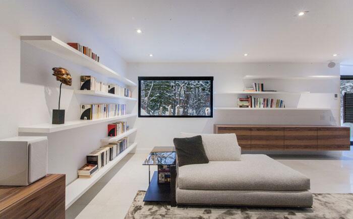 Планировка гостиной, предложенная студией Clairoux, выглядит необычно. Единственный мягкий уголок расположен в самом центре, на стенах огромное количество открытых полок. Да и окно тоже выглядит странно.