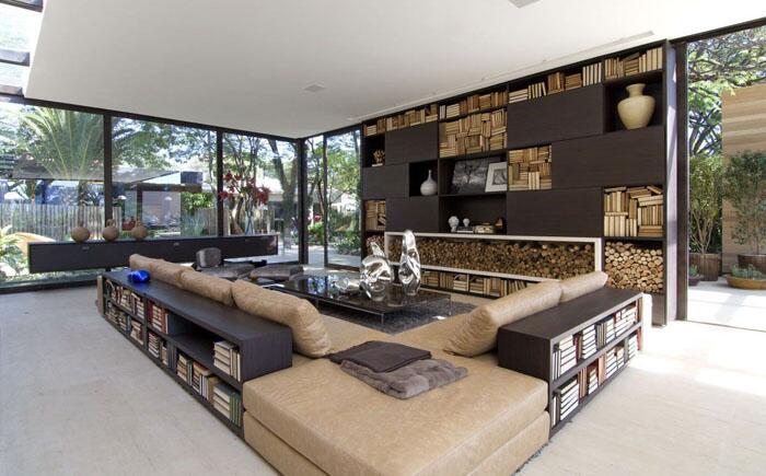 Желание приблизиться к природе дизайнеры из студии Fernanda Marques Arquiteto Asociados воплотили в гостиной Loft 24-7. В ней стеклянные стены, натуральная цветовая гамма, огромные окна и оригинальный стеллаж.