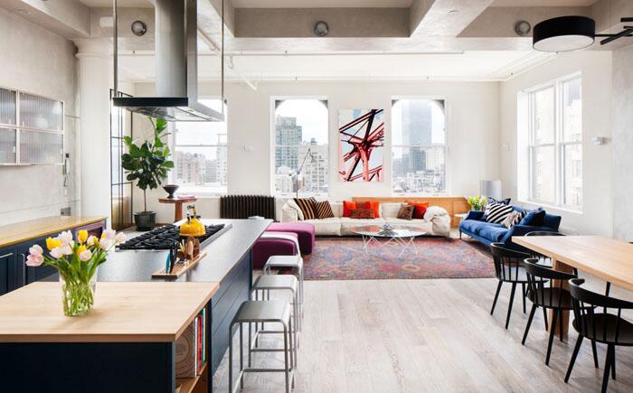 Дом от нью-йоркской студии Casamanara, возможно, не может похвастаться особым простором, но в нём определенно чувствуется оригинальный характер. Открытая планировка, которая включает в себя кухню, гостиную и столовую, объединила всё в единое целое. Узорчатый ковёр помогает зонировать пространство, а акцентные цвета выполняют роль композиционных центров.