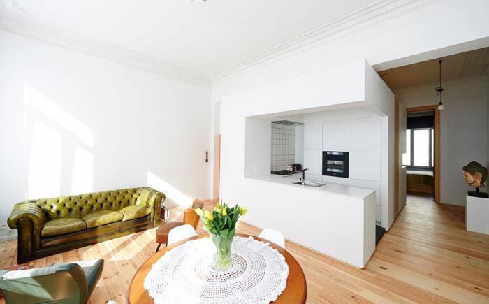 Не все гостиные могут похвастаться яркими красками и простором. Московская студия M17 оформила гостиную, которая внешне напоминает холл. Скульптурная стена выполняет массу дополнительных функций, позволяя комнате сохранить простоту и открытость. Впрочем, естественного света, безусловно, не хватает.