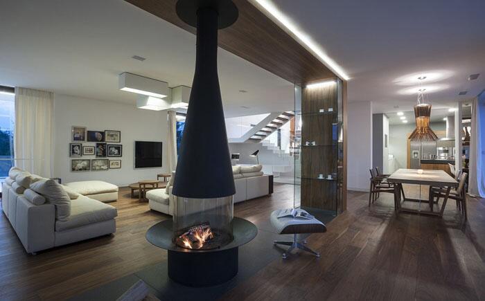 Расположение мебели в гостиной, созданной дизайнерами Studio O., весьма необычное. Они предложили превратить комнату в место, способное разместить большие группы людей, создав при этом комфортную и элегантную атмосферу. Камин встроен в несущую стену, им можно наслаждаться и со стороны столовой.