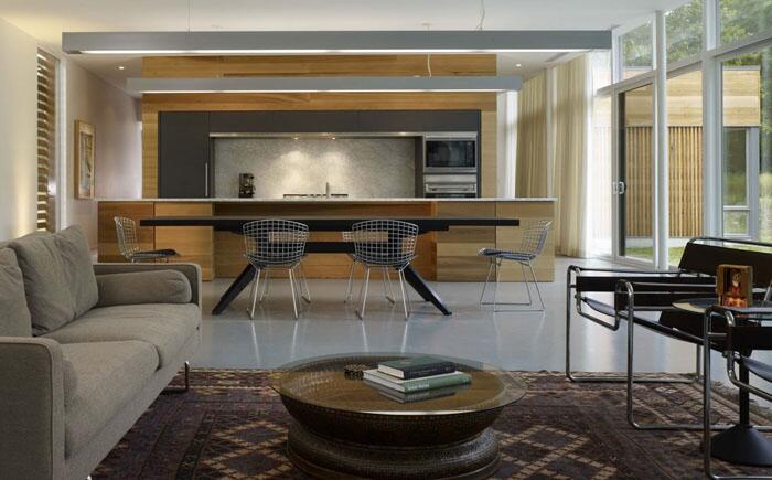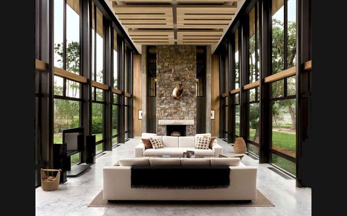 Стекло окружает эту длинную узкую гостиную, демонстрируя красоту ландшафта за окном. Декор комнаты полностью определяется тесной связью природы и интерьера, созданного специалистами компании SBCH Architects из Южной Каролины.