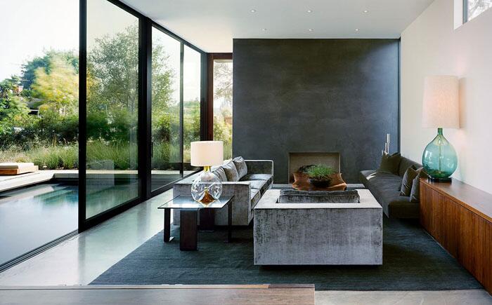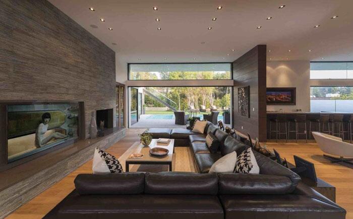 Гостиная внутри и открытый бассейн объединились в единое целое в проекте Vienna Way Residence от студии Marmol Radziner. Две зоны разделены раздвижной дверью и огромными панорамными окнами.
