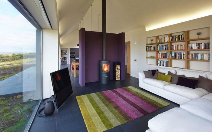 Дом, построенный специалистами шотландской студии Dualchas Architects, разделён на две зоны, которые отделены от кухни и столовой сиреневой перегородкой. Та, которая побольше, служит гостиной. Белый мягкий уголок, открытые полки, яркий полосатый ковёр на полу – всё продумано для создания уютной атмосферы.