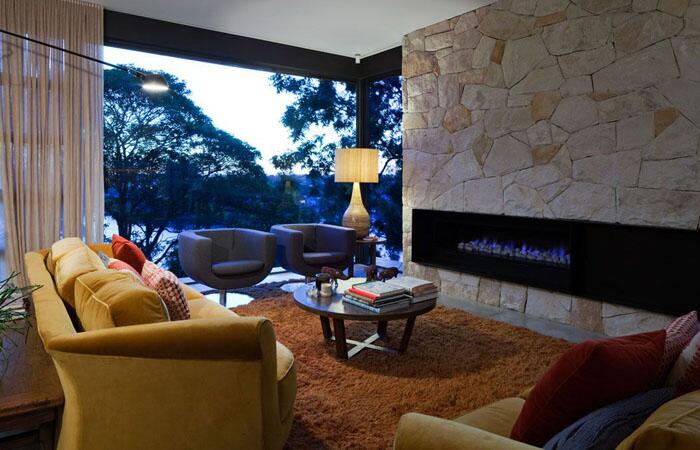 Широкий камин, встроенный в каменную стену, служит композитционным центром в гостиной, оформленной специалистами из студии MCK Architects в Сиднее. Текстурный ковёр создаёт атмосферу тепла и уюта, которую усиливают удобные диваны и кресла.