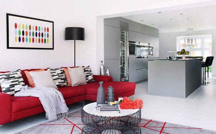 Некоторые дизайнеры предпочитают выделять интерьер за счёт цветовой гаммы и узоров. Специалисты студии LLI Design выбрали для небольшой гостиной красный секционный диван и оригинальный кофейный столик с металлической основой.