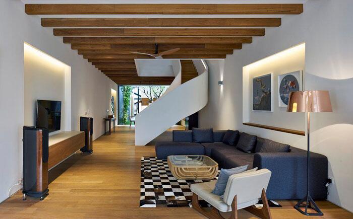 Эффектная спиральная лестница стала неотъемлемой частью интерьера гостиной, оформленной студией ONG&ONG. Она создаёт иллюзию дополнительной высоты и расширяет пространство. Чтобы компенсировать нехватку окон и солнечного света, дизайнеры покрасили стены в белый цвет и использовали акцентное освещение.