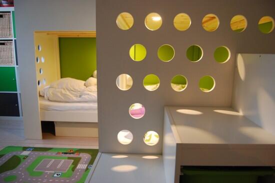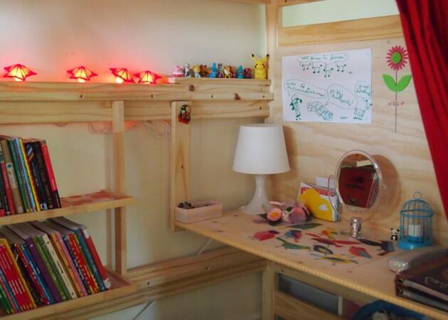 Под сооружение снова отводятся две стены, но в этот раз спальней служит уже верхняя часть. Также второй этаж стилизован под уютные симпатичные теремки, из которых точно не захочется вылезать в школу.