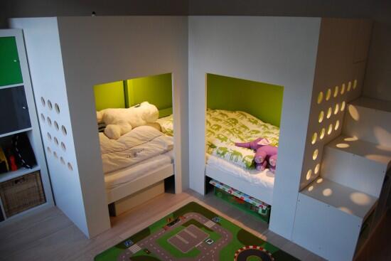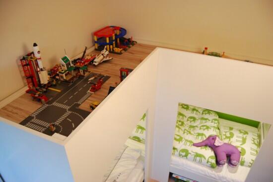 Движемся дальше! А что, если перестать зацикливаться на одной стене и задействовать угол? Потенциал такой идеи позволяет с комфортом разместить двух подростков на нижнем уровне, а верхний задействовать под расширенную игровую площадку.