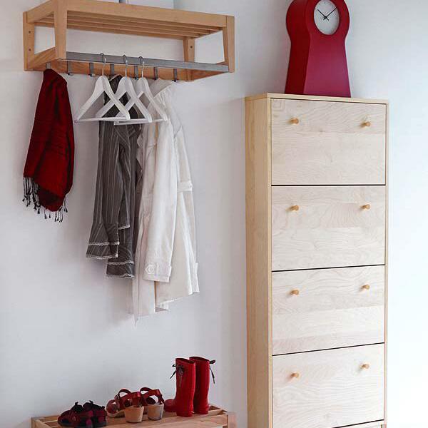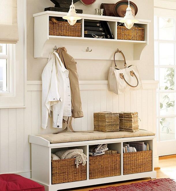 Ящики для обуви или для одежды можно использовать сами по себе и как комбинации со скамейками (чаще всего ящики прячутся под скамейку) или с полками (например, плетеные ящики отлично будут смотреться, как украшение полки). Очень удобны и плетеные корзины — они прекрасно впишутся в стили прованс и кантри. Их можно как накрыть крышкой или оставить открытыми. Неоспоримым преимуществом ящиков и корзин является то, как легко в них навести порядок.