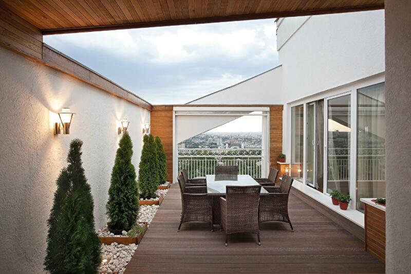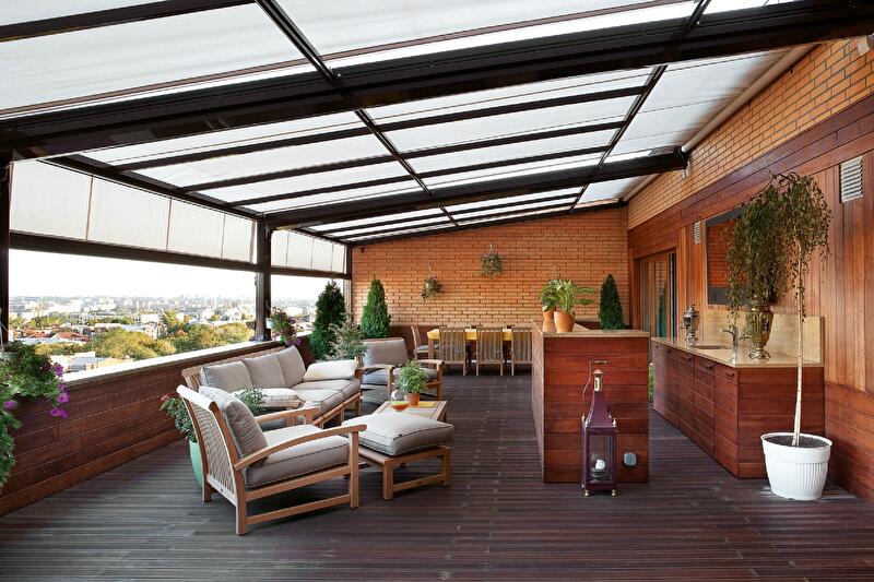 В городе отдыхать «на природе», не выходя из дома, позволяют открытый балкон или терраса. Представляем вам пять проектов, авторы которых уделили особое внимание оформлению просторной террасы, являющейся продолжением интерьера.